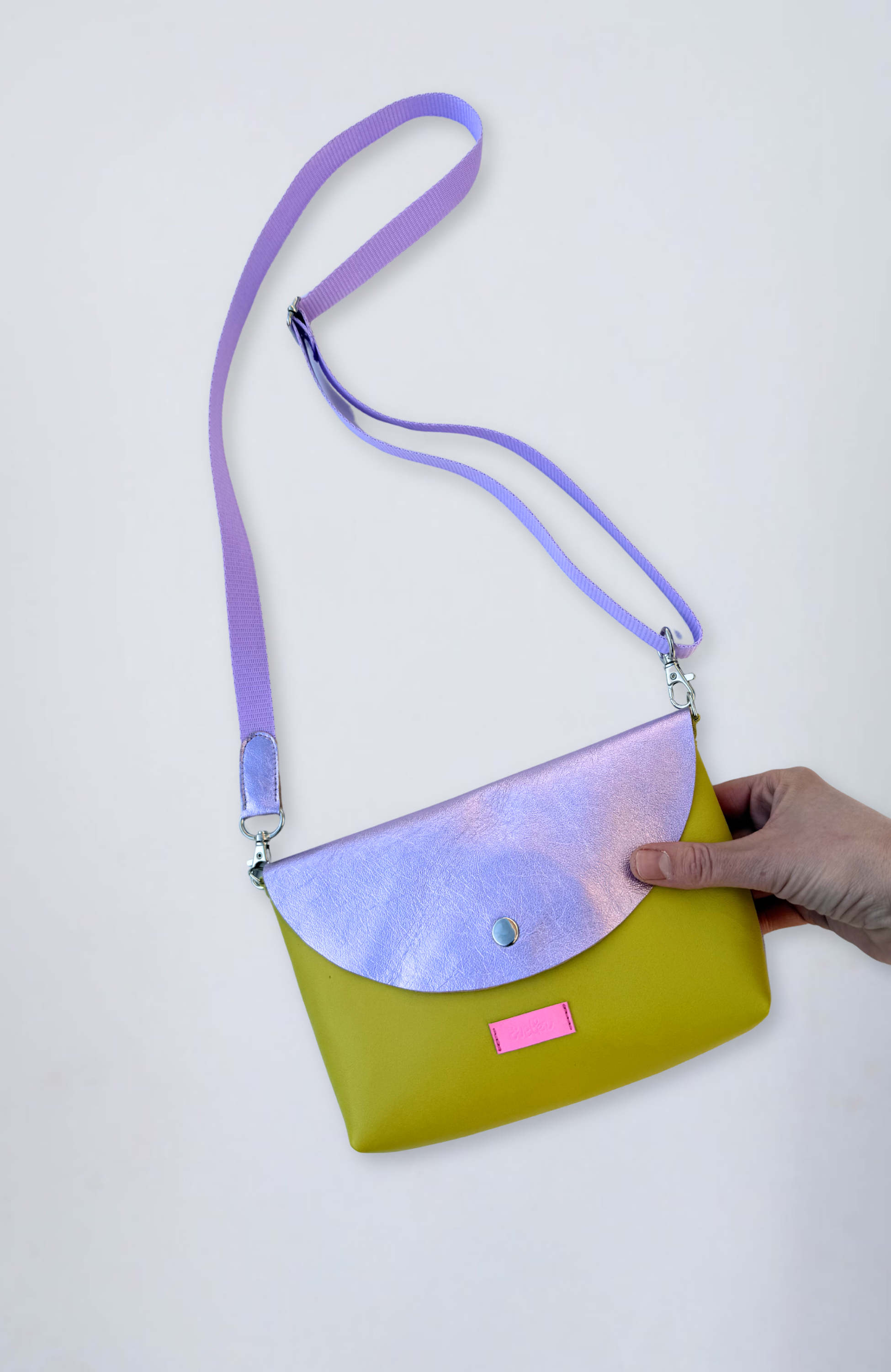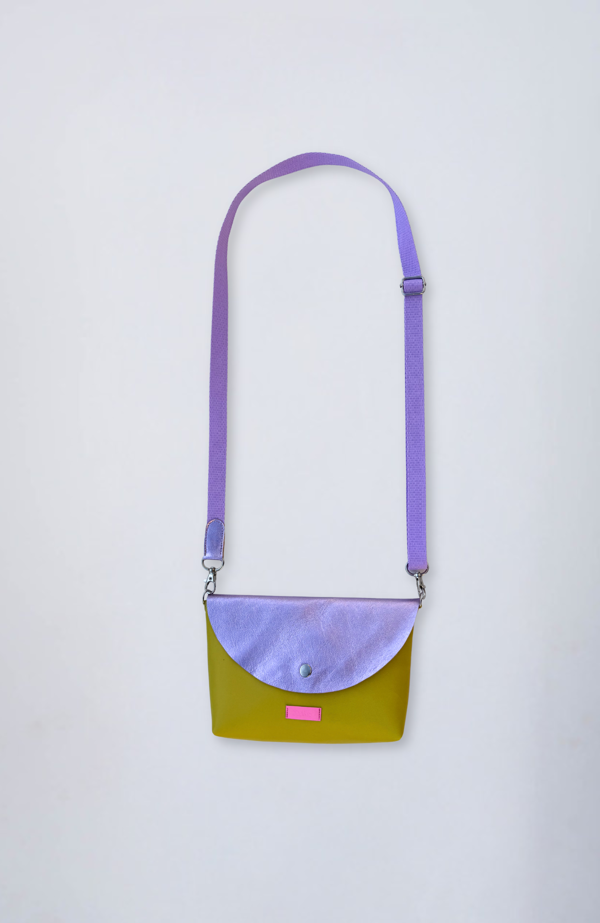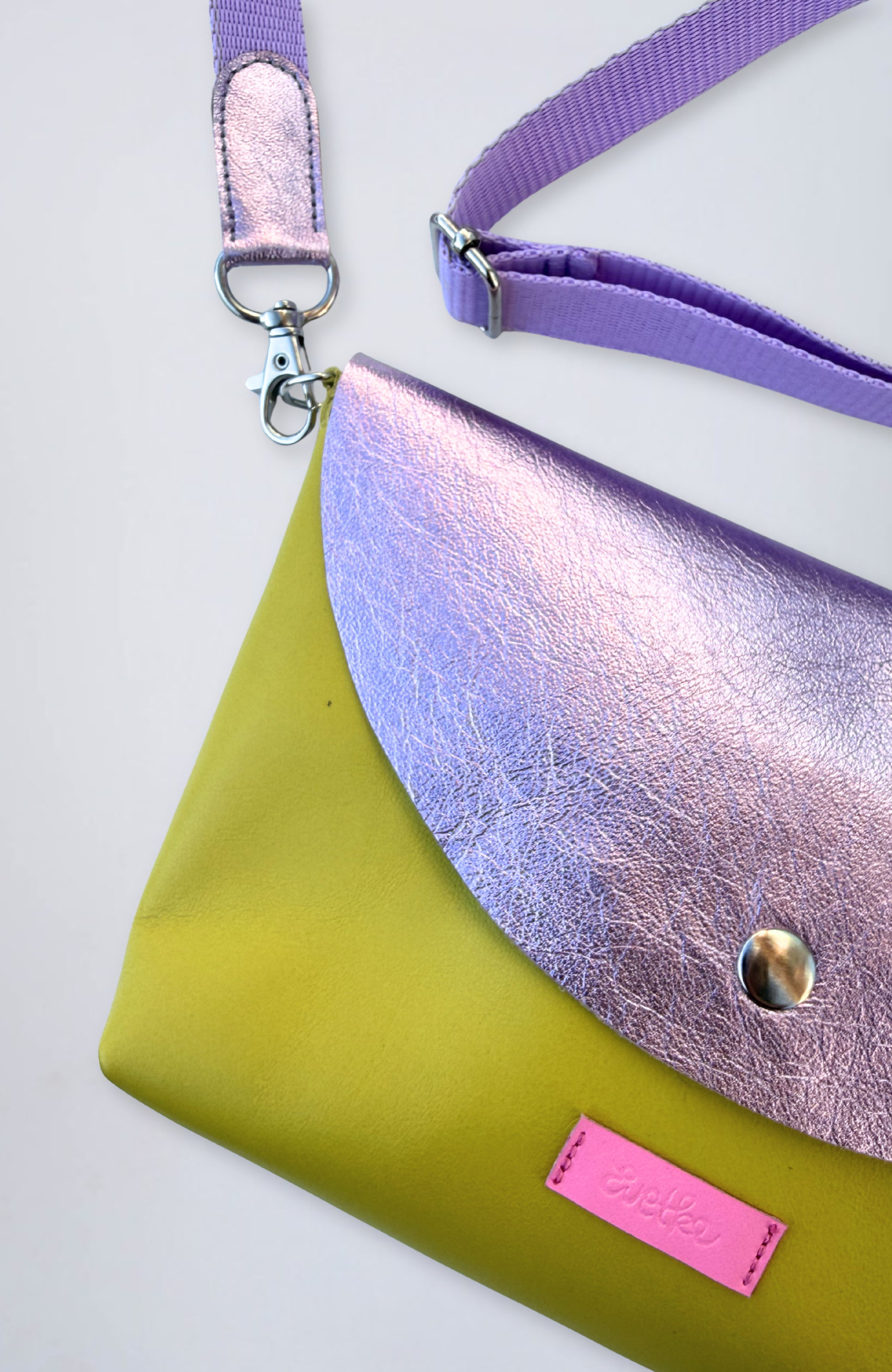 Valódi bőrből készült kis táska puha levendulás csillogású fedéllel és lime színű  testtel.