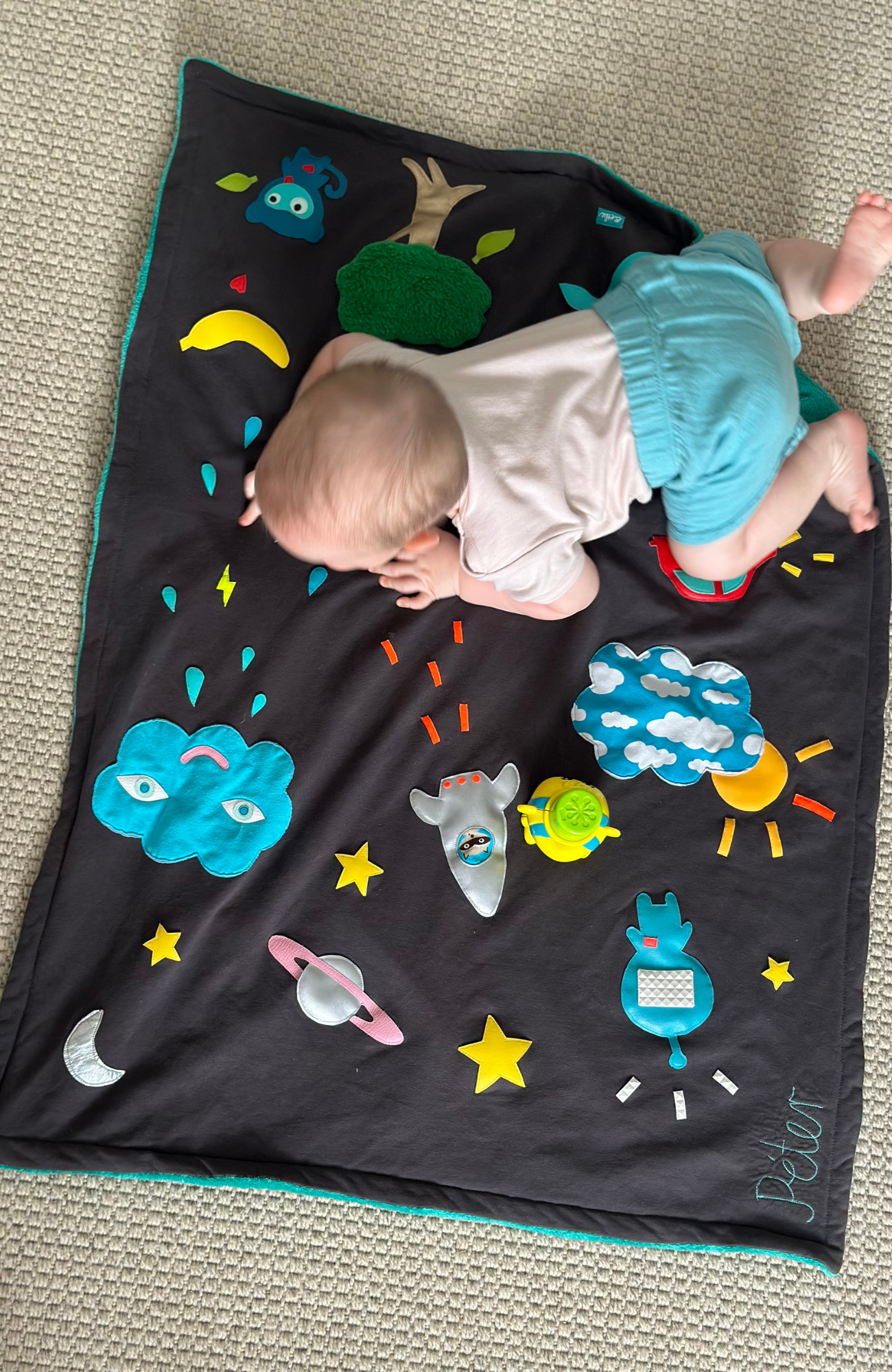 Ez a puha, meleg babapokróc nemcsak kényelmes, hanem egy igazi kis mesebirodalom! Színes, vegán bőrből kézzel kivágott és rávarrt aranyos minták díszítik – kisautó, unikornis, űrhajó, fa, falevél, bogár, madár, bálna és még sok más kedves figura, amelyek vidámságot csempésznek a mindennapokba.