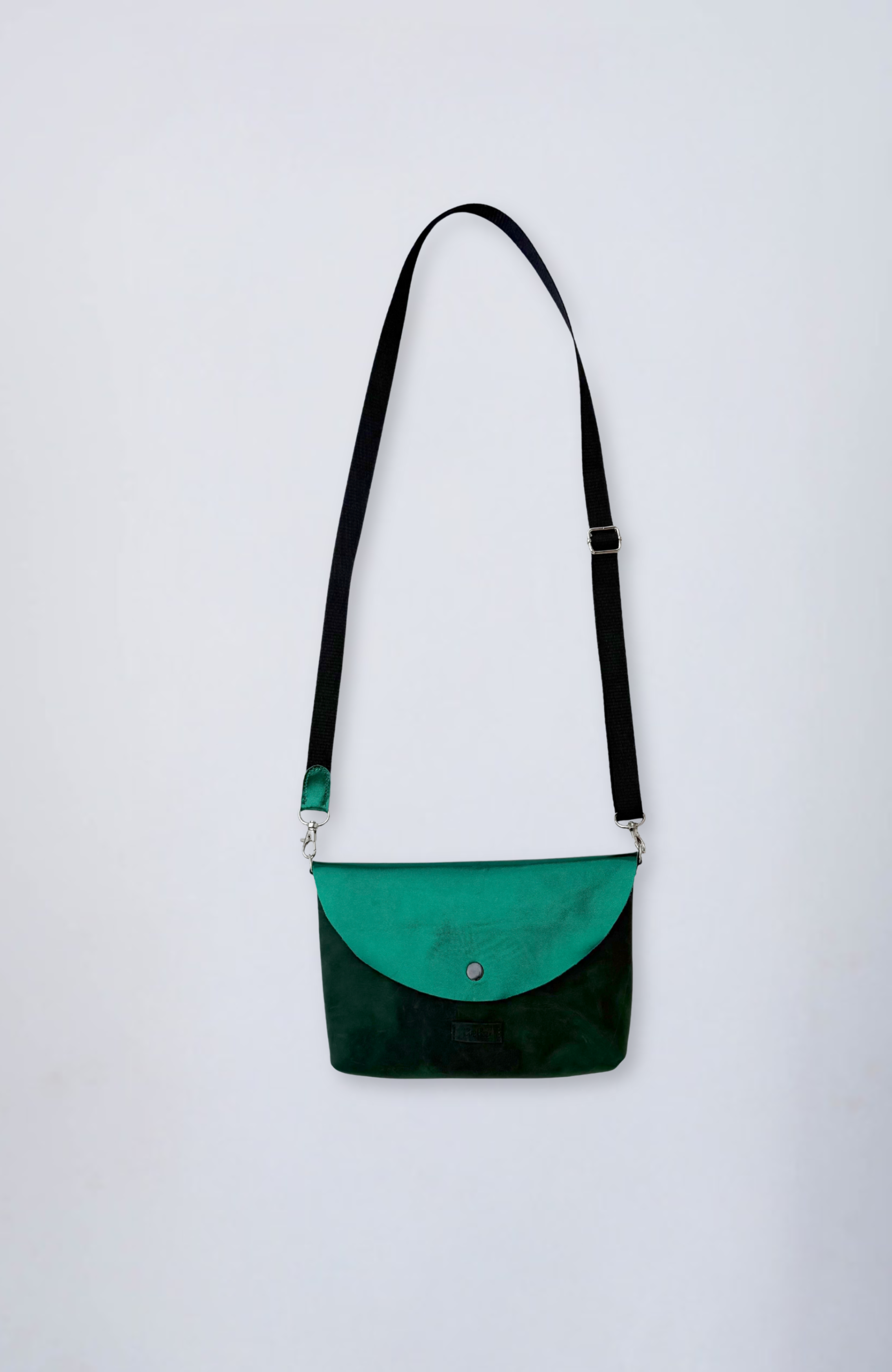 Valódi bőrből készült kis táska smaragdzöld fedéllel és mélyzöld testtel.